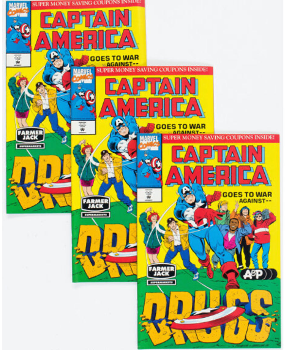 Captain America Goes to War Against Drugs (1990 Giveaway). Farmer Jack and A&P Supermarkets edition. This edition printed in 1992, includes Over $12.00 in coupons for Farmer Jack and A&P Supermarkets. Farmer Jack and A&P Supermarkets, located in Michigan, sponsored this book with endorsement from the Southeastern Michigan Assocition Cheifs of Police. Their goal was to reduce substance abuse by educating parents, students, and employers about the menace of drugs. "High Heat" written by Peter David with art by Sal Velluto. Full color, 32 pages, standard paper stock.