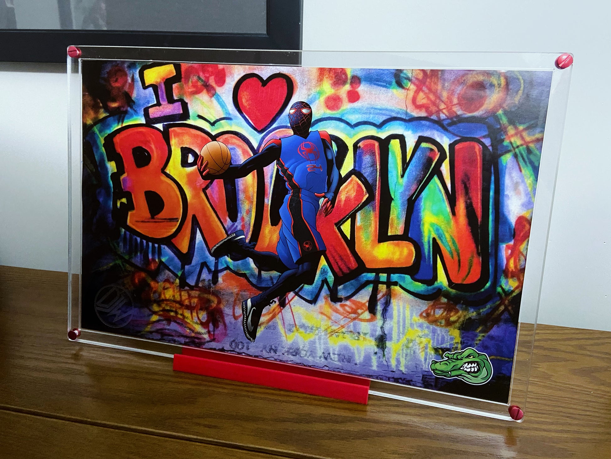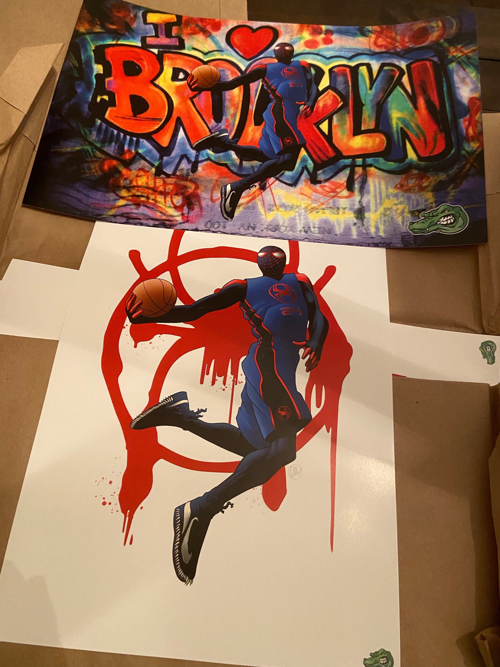 The legend of Kobe Bryant, in one of his iconic dunk poses in this Miles Morales homage by DJWART. You will receive both the logo and Brooklyn background in this 11x17 100-lb paper print. Check out our 11x17 GG-L frames for protection and awesome display-ability, that can be hung on the wall. The prints (only) are Shipped in a mailing tube.